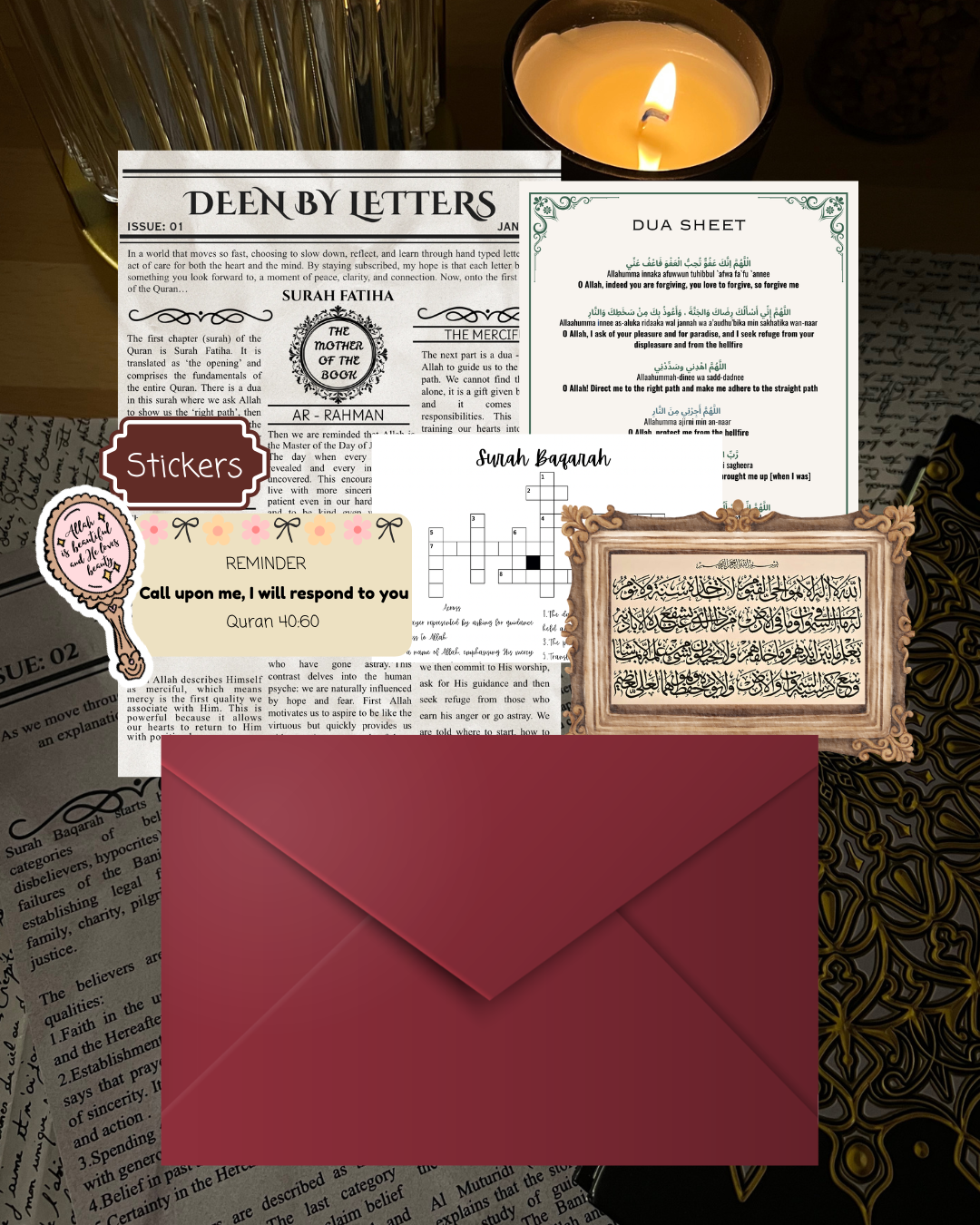 While the specific contents change each month to fit the theme, every envelope is curated to help you learn and reflect. You can expect a deep-dive letter on the Surah, accompanied by creative keepsakes, visual reminders, or sensory gifts designed to bring that chapter to life.